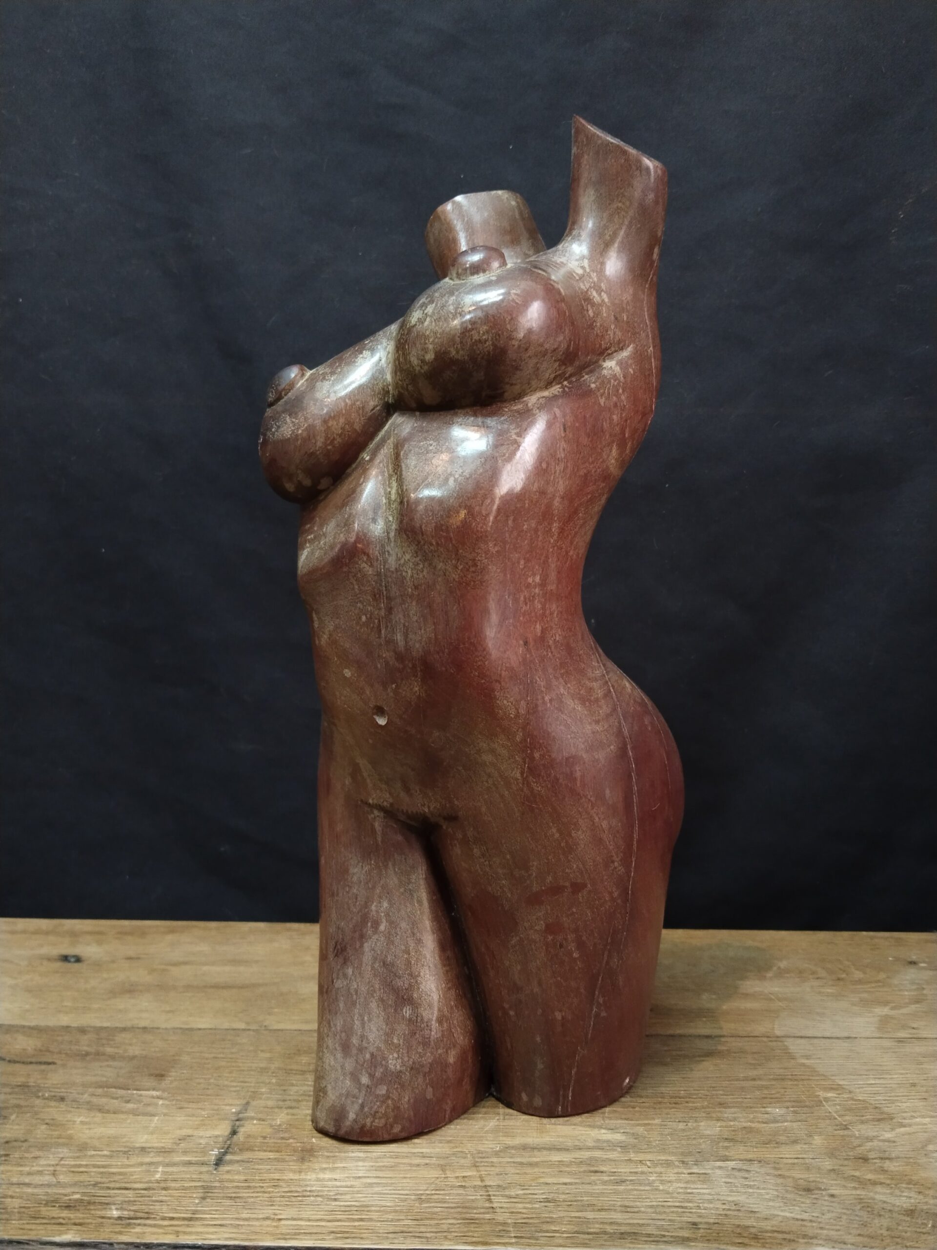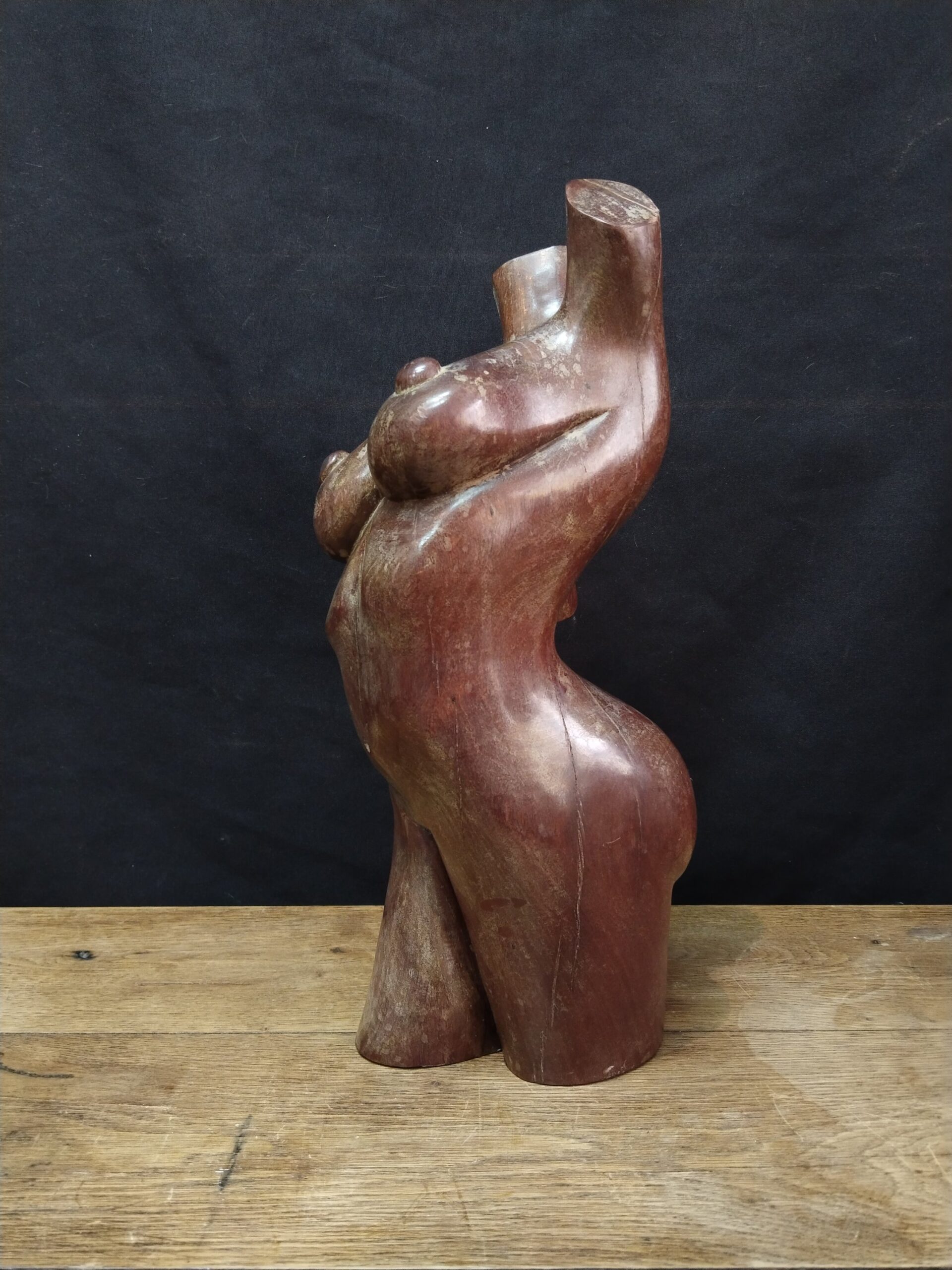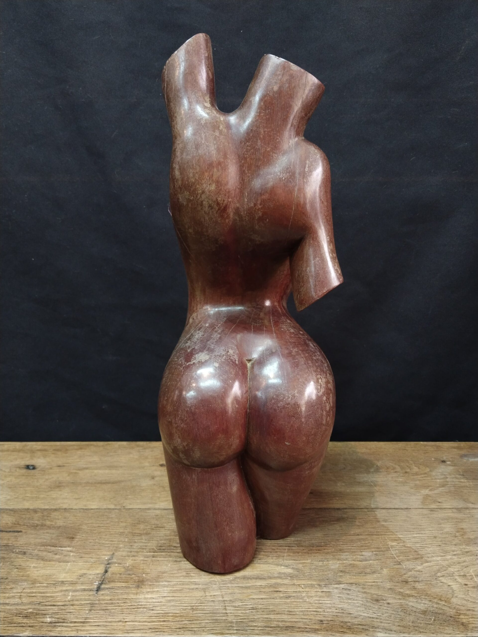 Escultura realizada en madera tropical de gran densidad representando el cuerpo desnudo de una mujer.