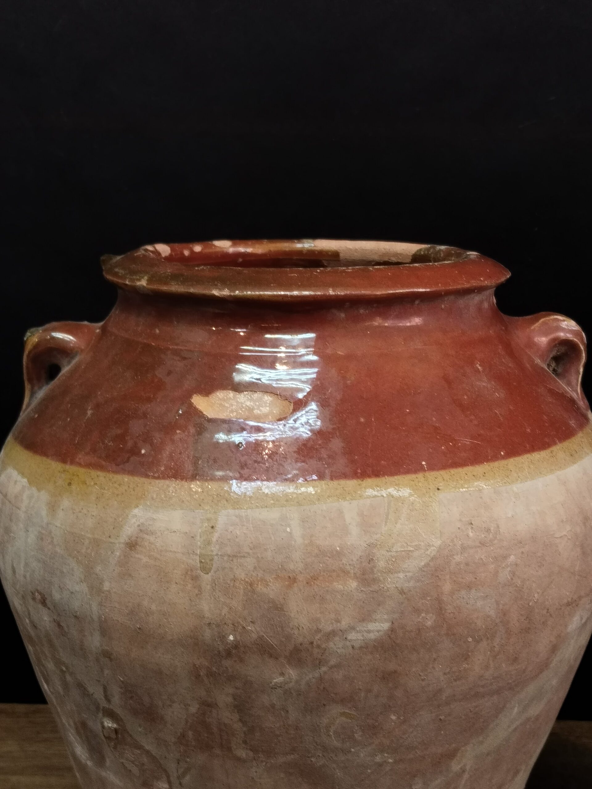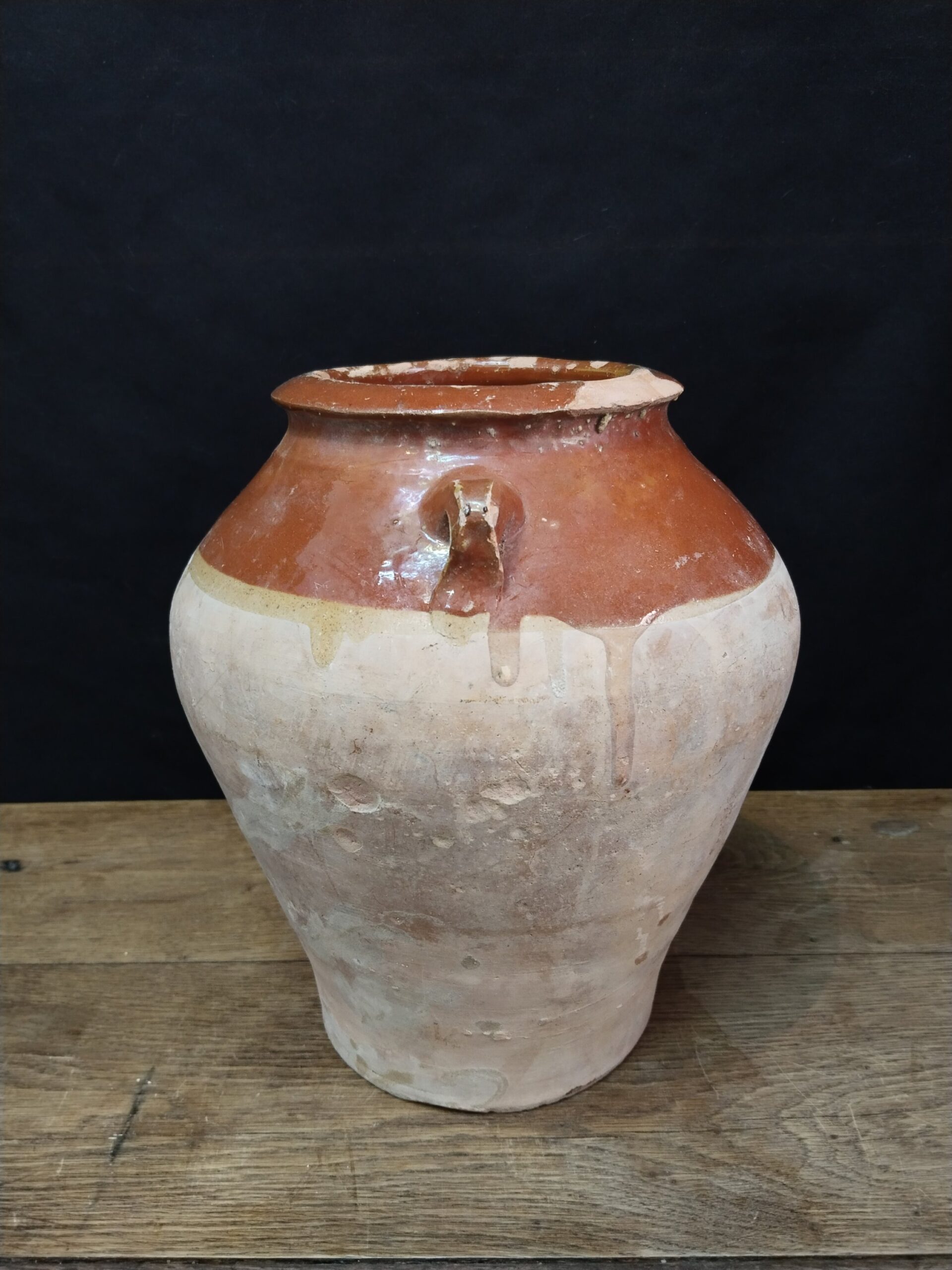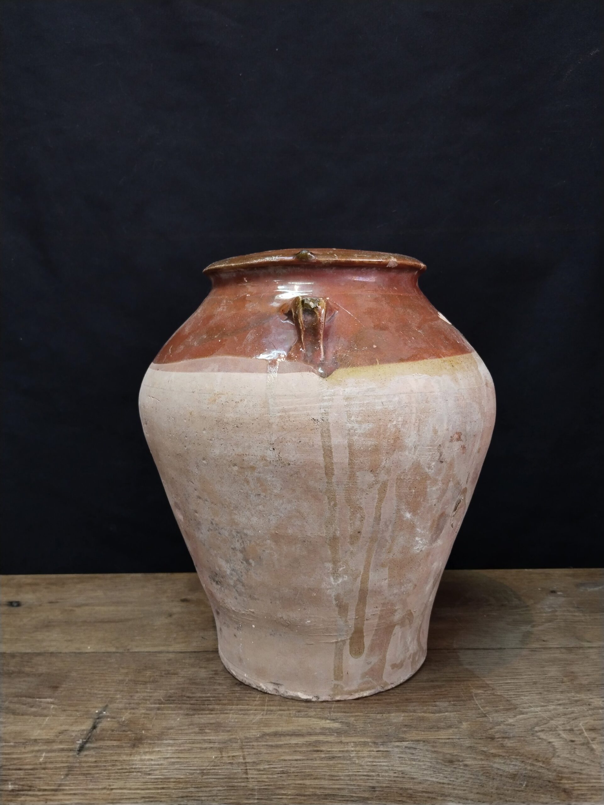 Olla de cerámica catalana parcialmente vidriada en tonos marrones.
