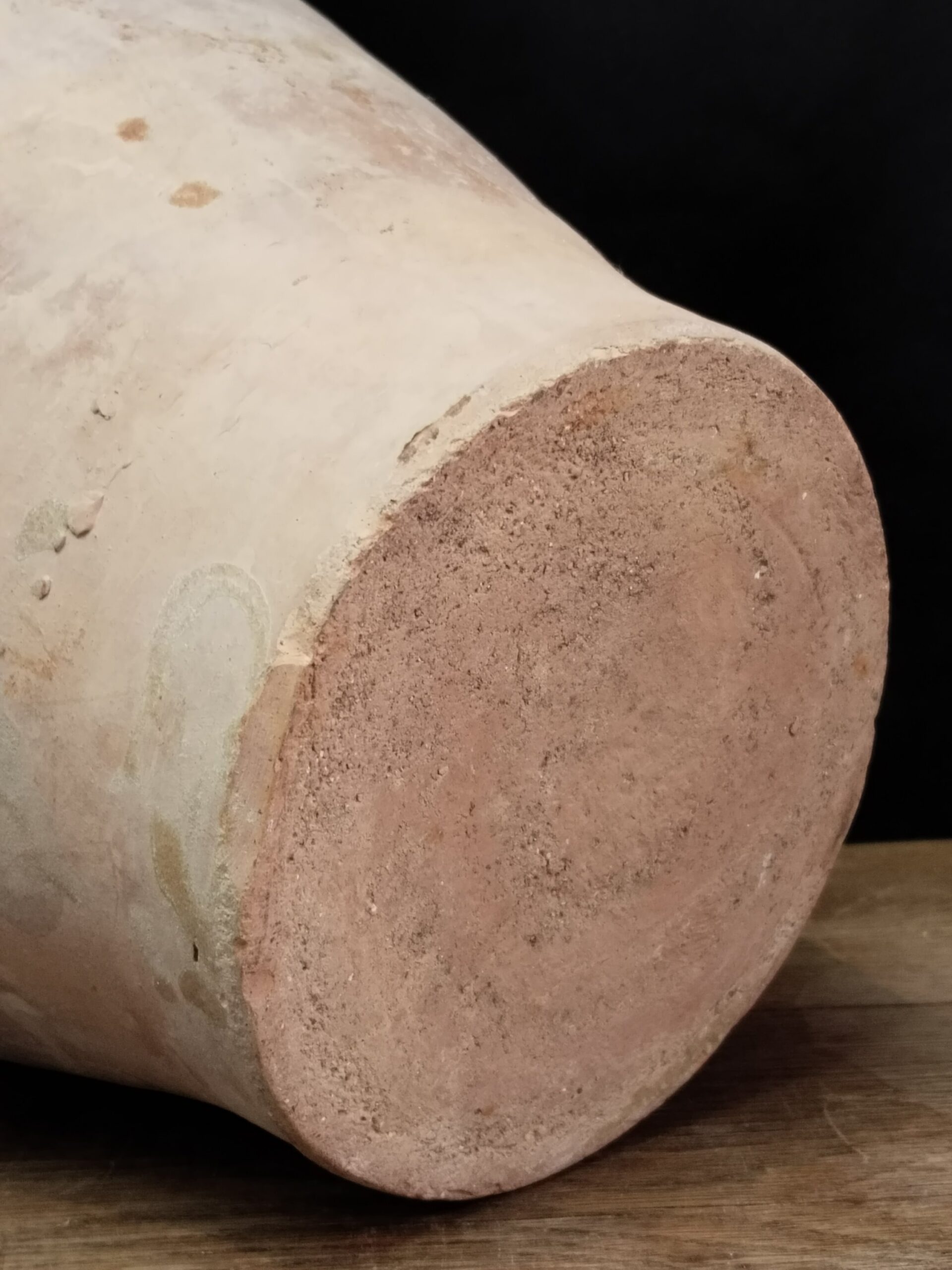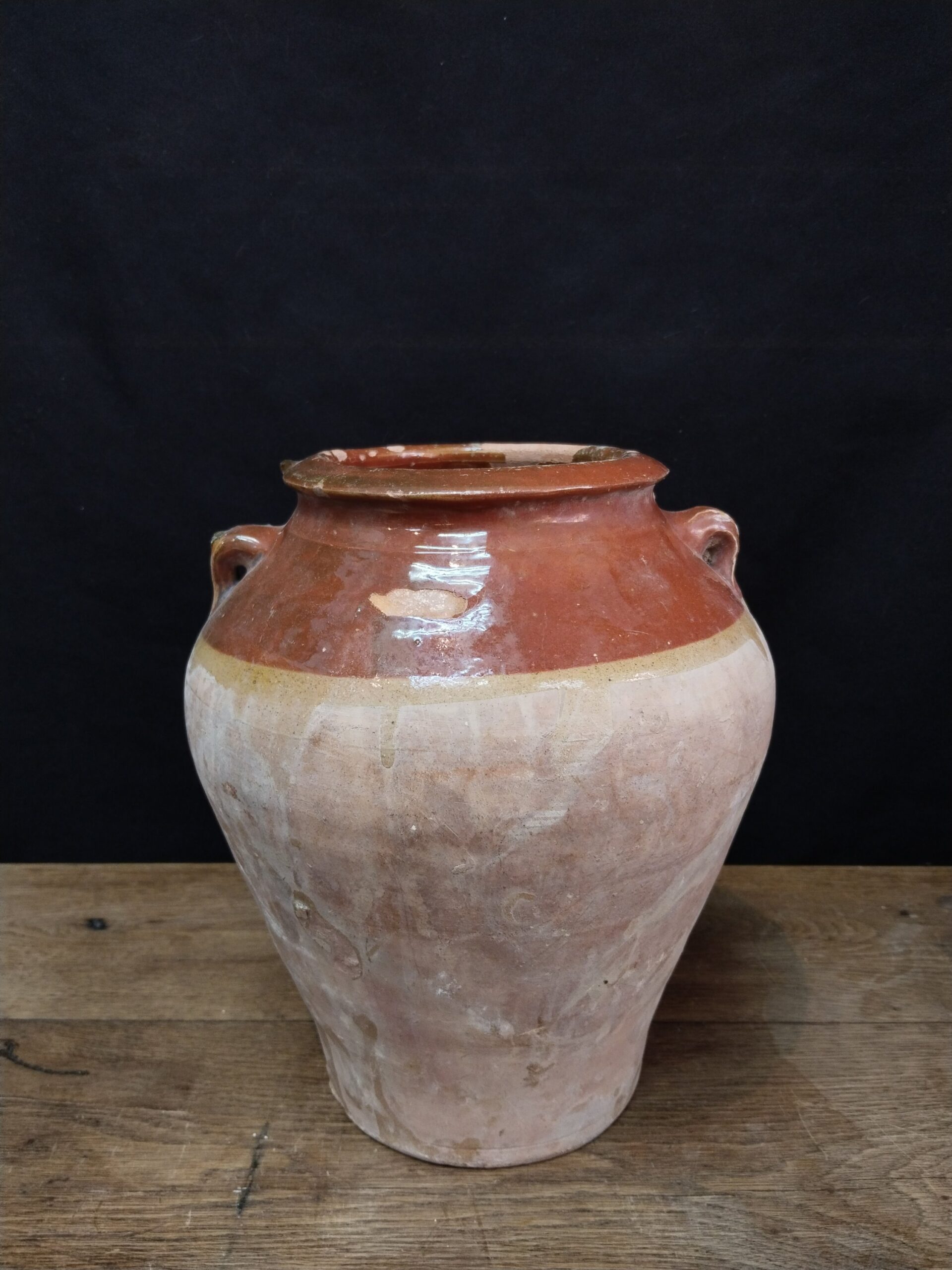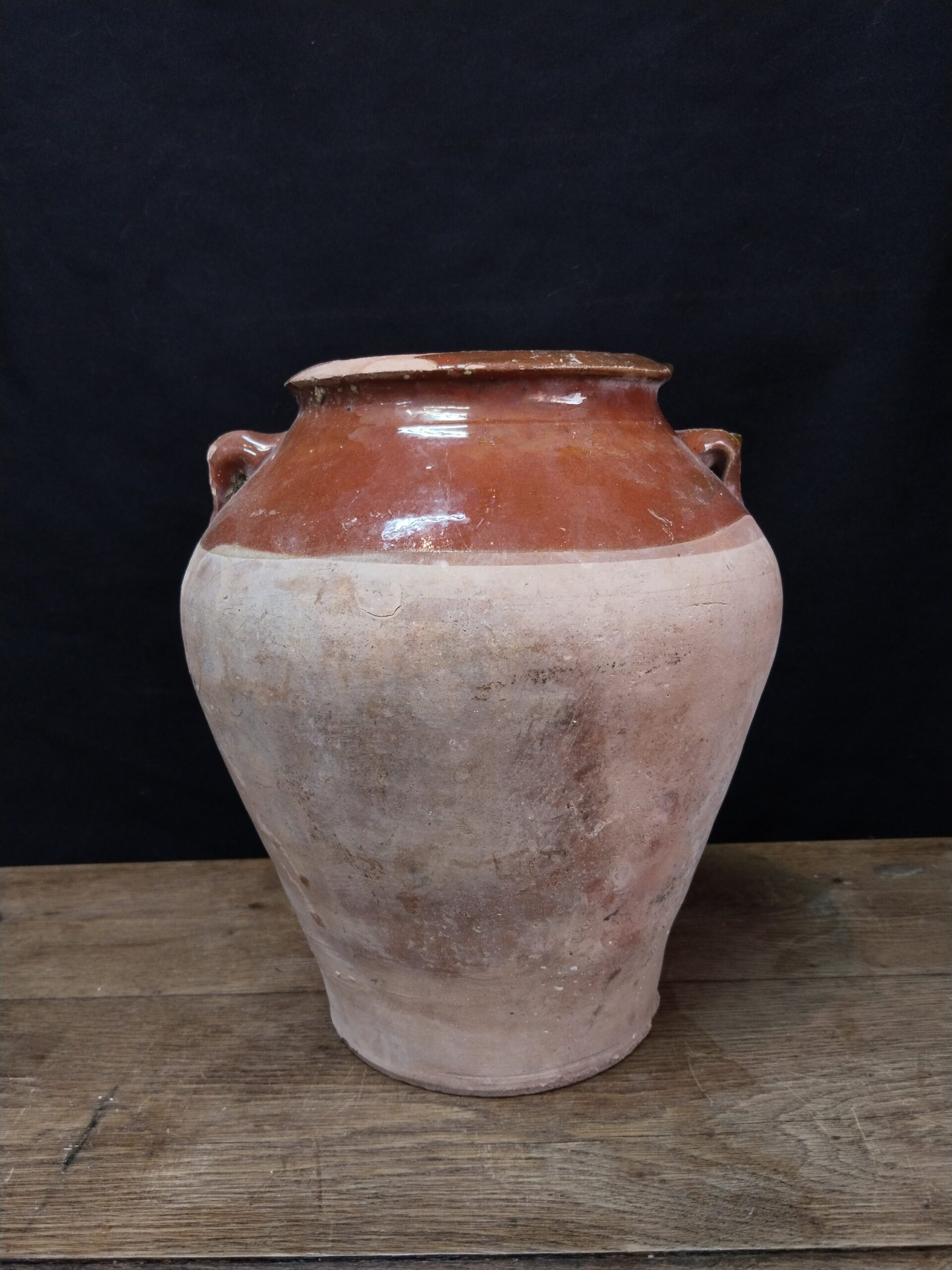 Olla de cerámica catalana parcialmente vidriada en tonos marrones.