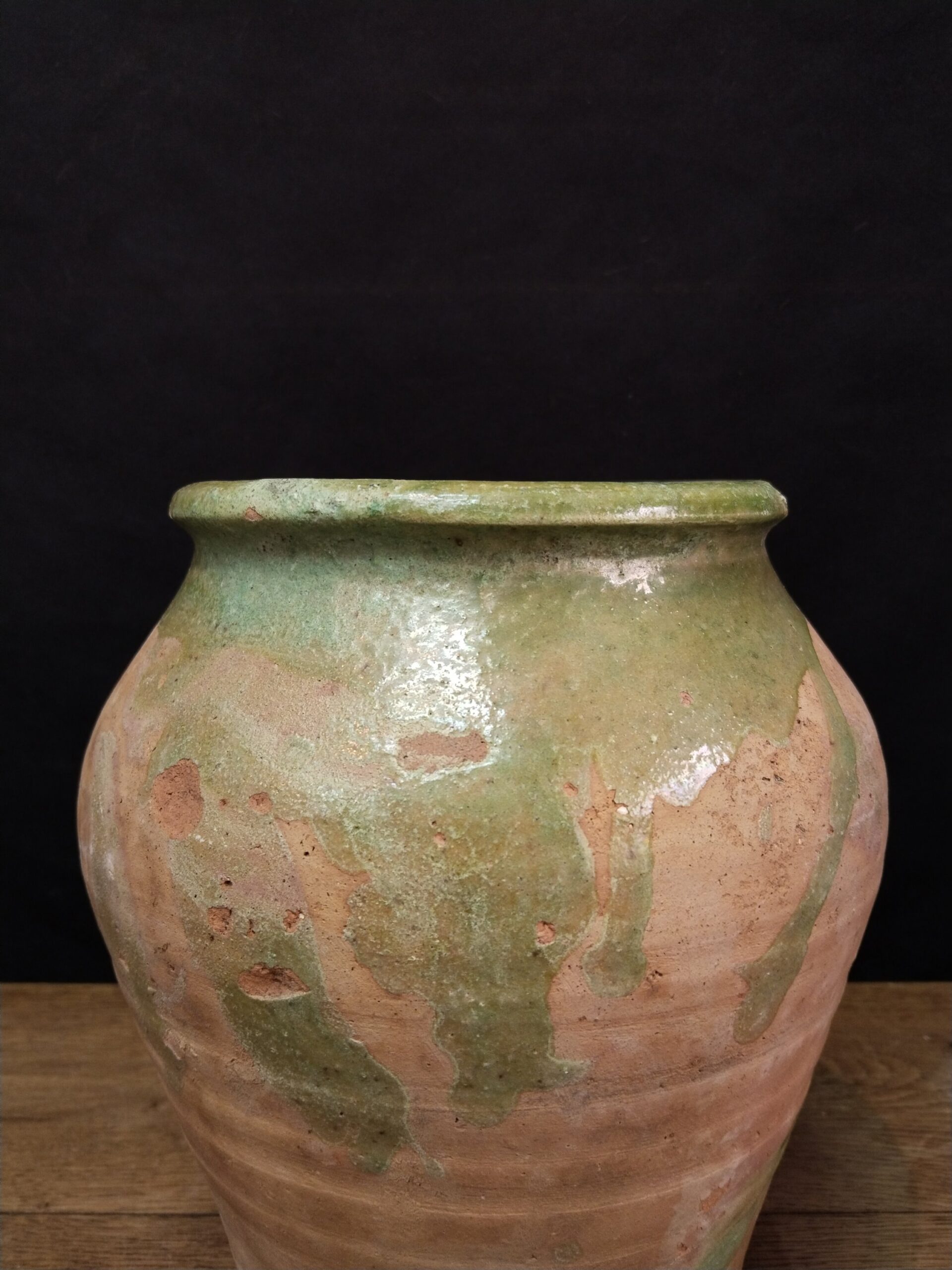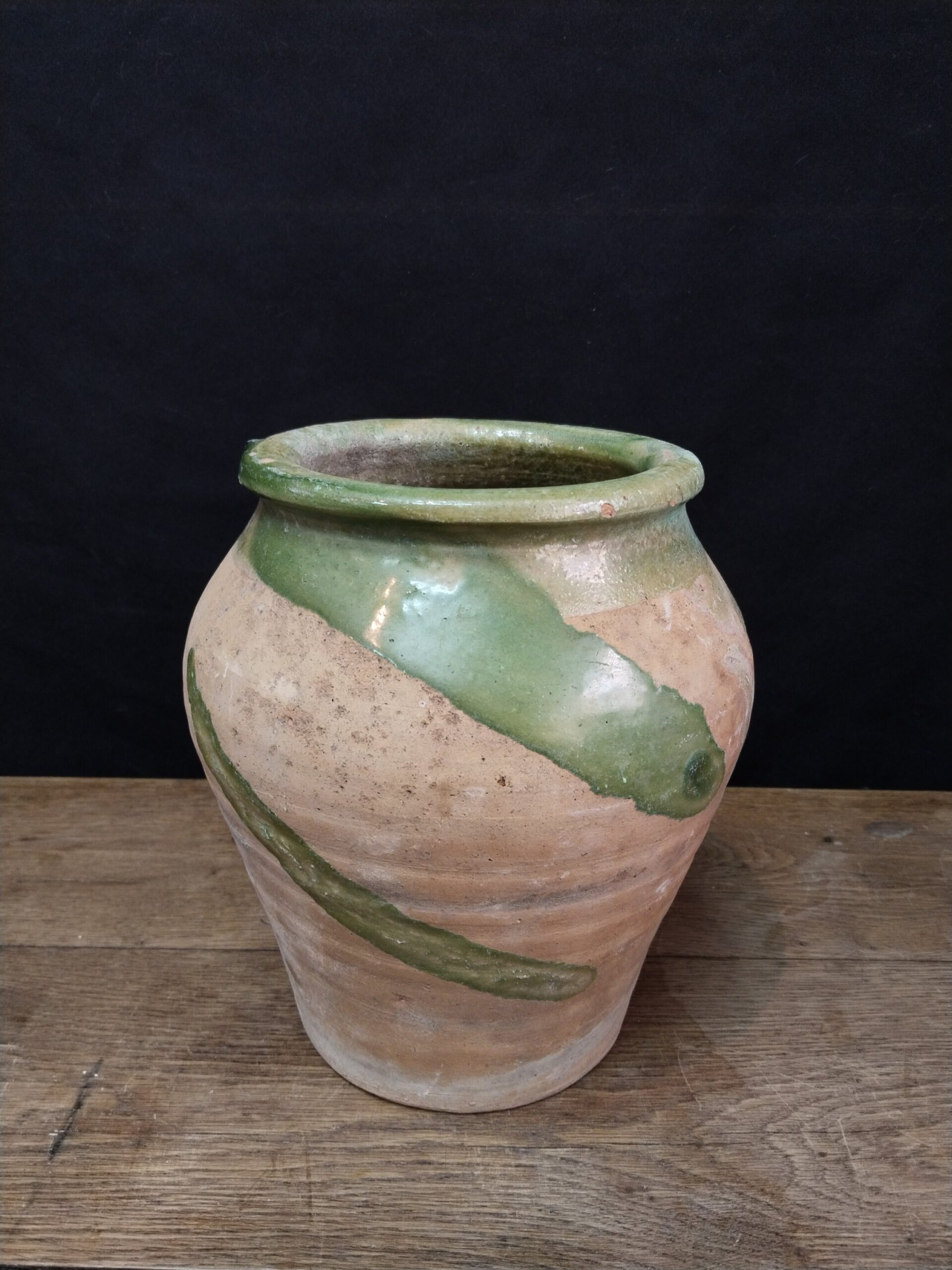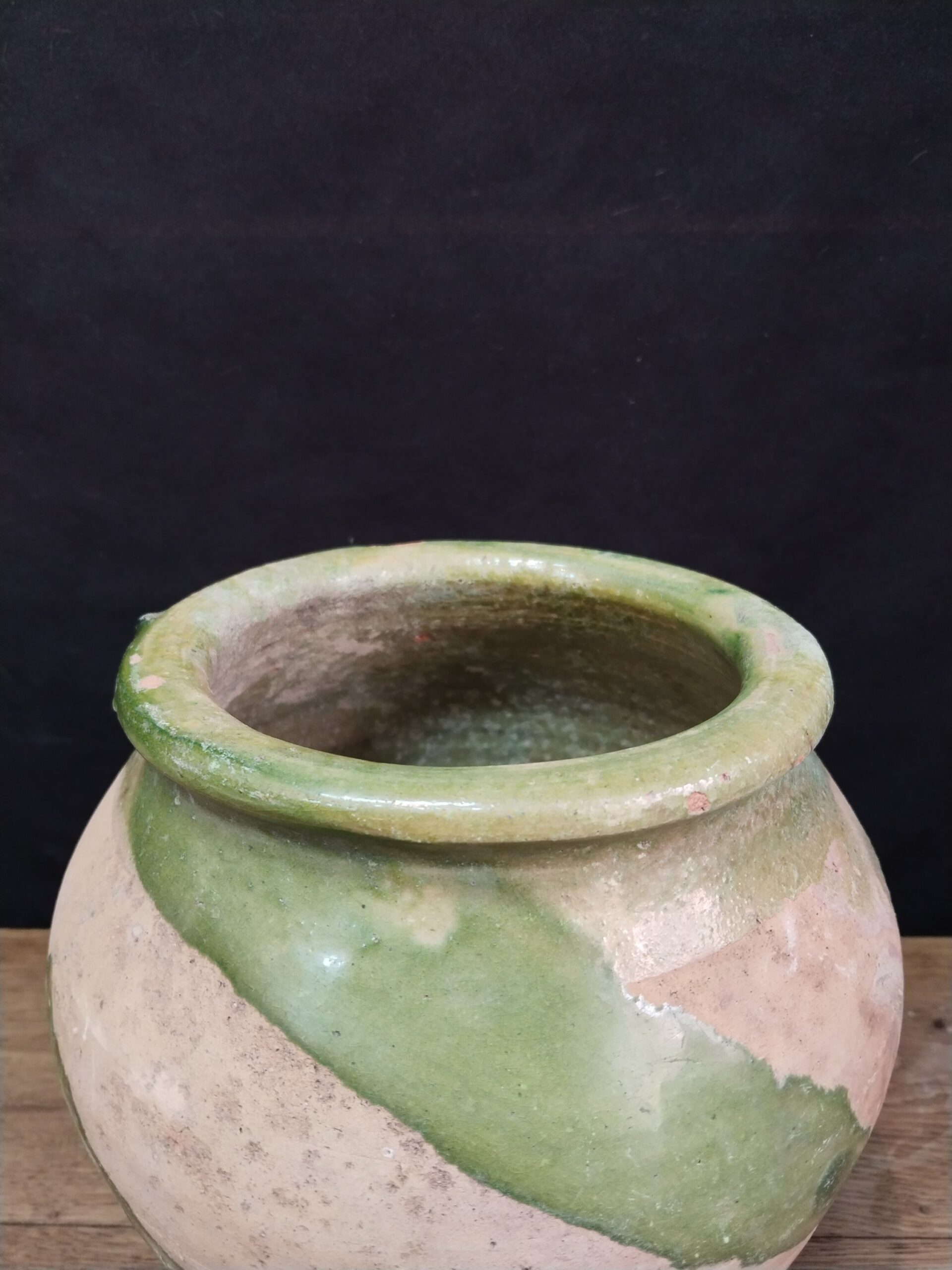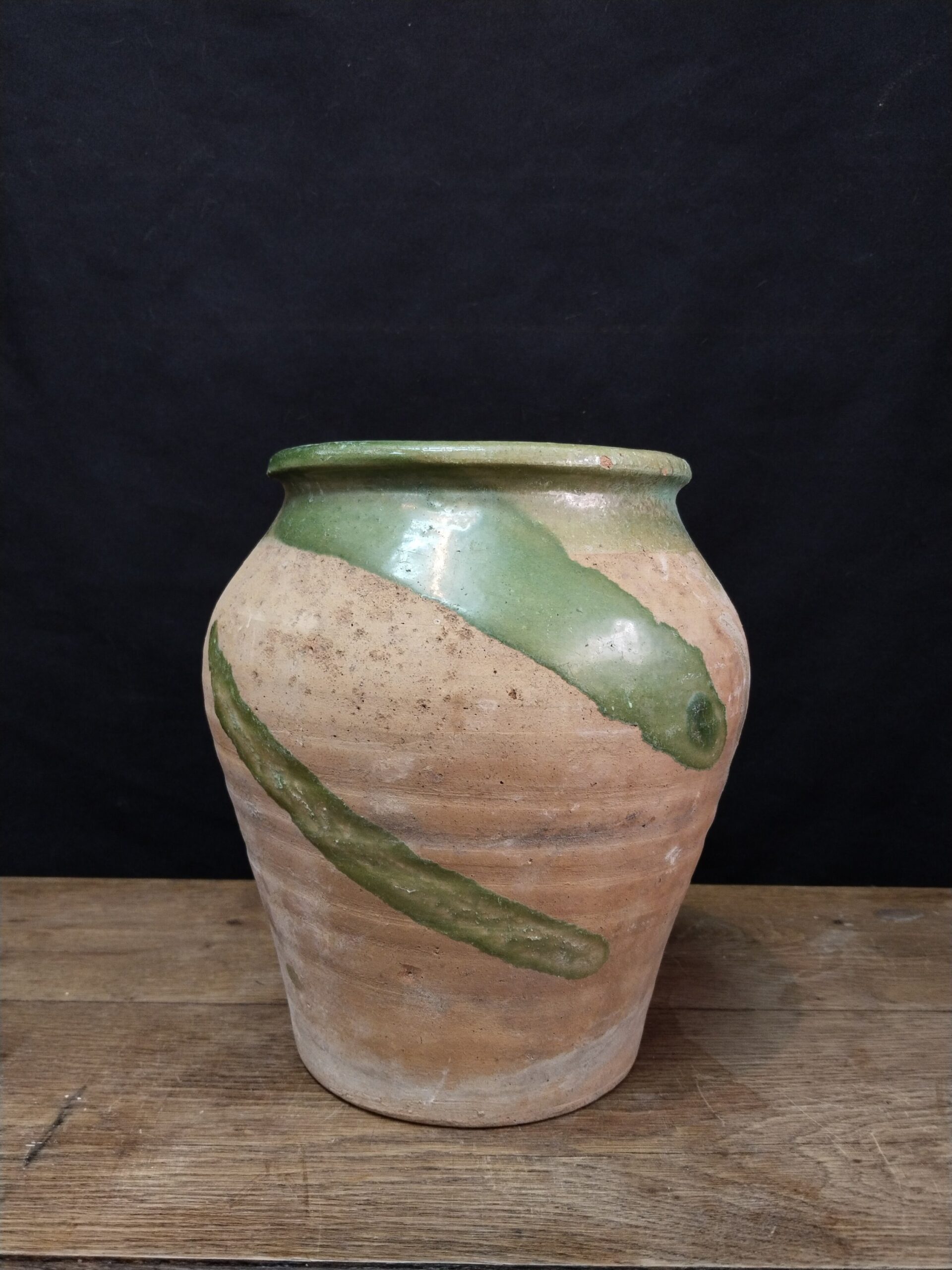 Olla de cerámica parcialmente vidriada en tonos verdes procedente de Castellón. Mediados del siglo XX. Tamaño: 20,5 cm de altura x 17 cm de diámetro máximo.