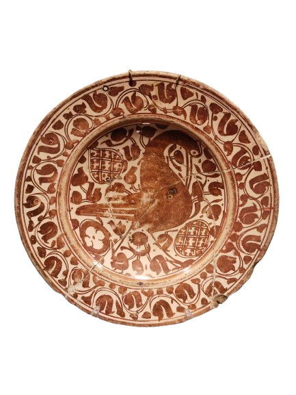 Plato de reflejo metálico en cerámica de Muel, Zaragoza.